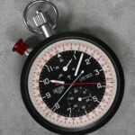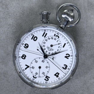 We look at Heuer’s catalogs over the decades, and wonder why the company never made a split second chronograph for the wrist. Nick Biebuyck, Heritage Director at TAG Heuer, offers this response, “Heuer always sought to produce the most functional types of timepieces and the type of precision timekeeping that was required for racing, rallying and other sports required the larger dial of a pocket chronograph, rather than the smaller dial of a wristwatch. When you compare the “display” that is possible with a 36 or even 40 millimeter wristwatch to what you get with a 52, 57 or even 65 millimeter pocket timer, there is an enormous difference. For reading 1/5 or 1/10s of seconds, or even full seconds, you need the larger display of the pocket timepiece.”