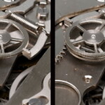 We can quickly identify a split-second timer by its large “pincers”, which are the brakes that stop and release the wheel that is attached to the split-second hand. A properly adjusted movement is able to stop the split-second hand in an instant, allow the primary second hand to continue running (with no interference from the stopped hand) and then reliably reunite the two hands, as they continue running together.