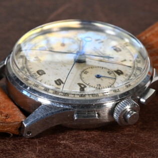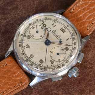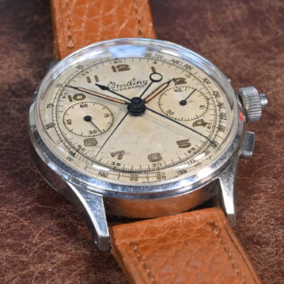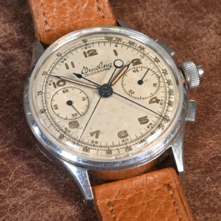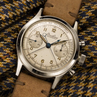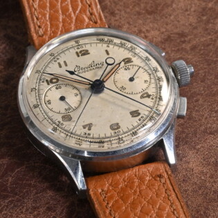 Willy Breitling showed his first split-second chronograph for the wrist (named the “Duograph”) in the company’s 1940 catalog, but assembling these complicated chronographs for serial production must have proven to be difficult. It was only in 1943 that the Breitling Duograph would enter serial production, with the first model being the Reference 762, a 36 millimeter chronograph powered by the Venus 179 movement.