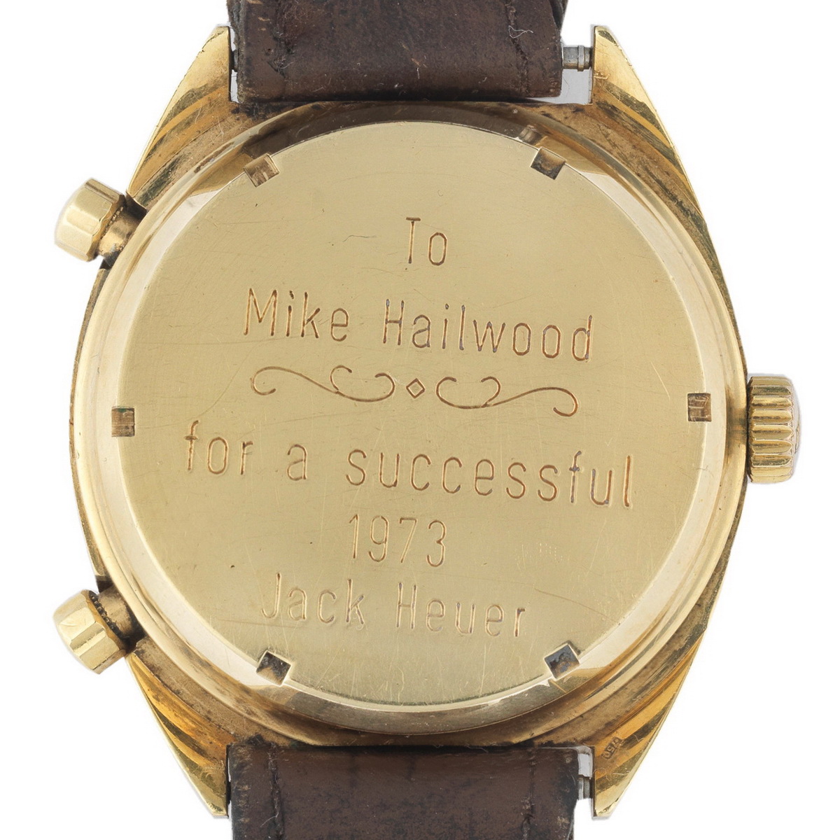 The case-back is engraved — “To Mike Hailwood for a Successful 1973. Jack Heuer”.  This was similar to the engraving that Jack Heuer used on the 18 karat gold Carrera that he presented to Ronnie Peterson.