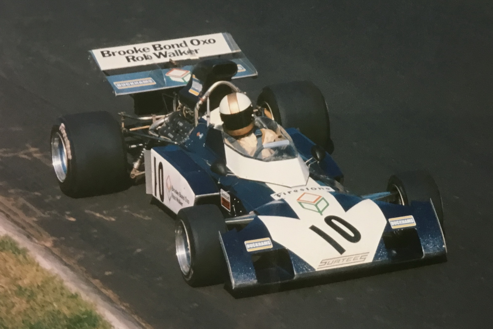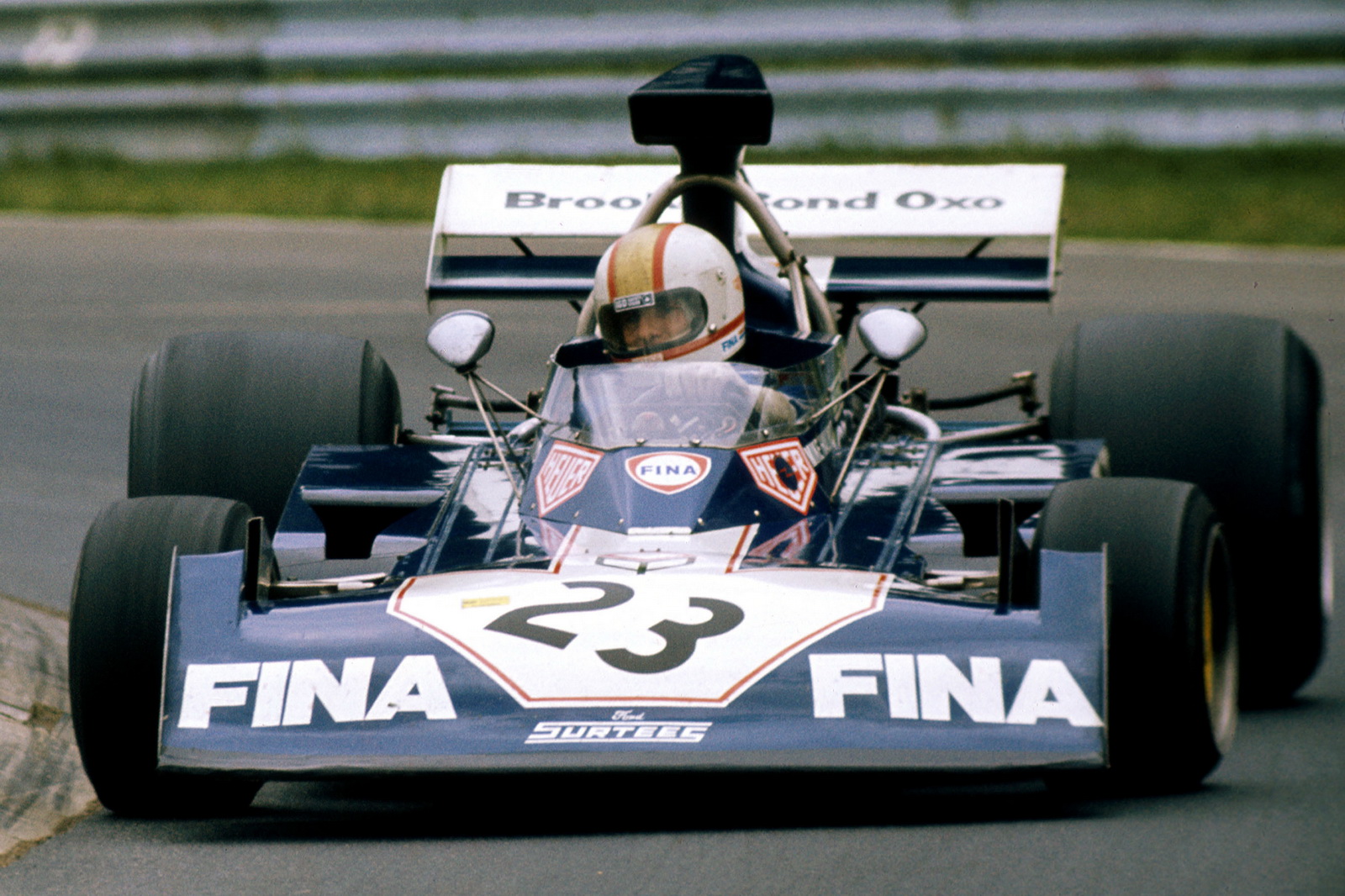 Jack Heuer, CEO of Heuer-Leonidas in the 1960s and 1970s, was known to enter into sponsorships with drivers or teams on very simple terms — Heuer would provide the driver with a Heuer chronograph (and perhaps some cash for his team), the driver would wear a Heuer patch on his racing suit, and the car would have a decal with the Heuer logo.  It appears that Heuer provided such a sponsorship for Mike Hailwood, for the 1973 season, as Hailwood wears the Heuer patch on his racing suit and a Heuer logo on his helmet, and there are Heuer decals on the Surtees TS14A Cosworth.