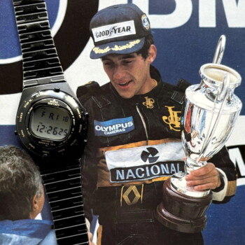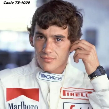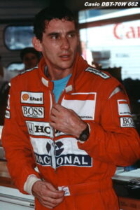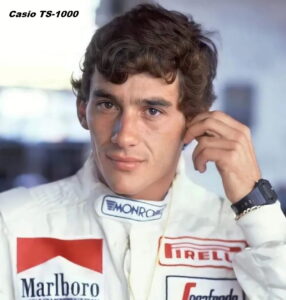 Ayrton Senna was very much a “tool watch” kind of guy, favoring practical functionality over flashy designs or luxury prestige. He usually wore the same watch at home, at work (racing) and at play. Prior to Formula 1, during his Formula Ford and Formula 3 seasons, Senna was mostly seen wearing LCD digital watches, typically a Casio. In his 1984 F1 rookie season with Toleman, Senna wore a Casio TS-1000, distinguishable by the white thermometer dot.