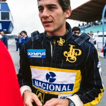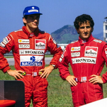 Having won the 1988 World Championship over archrival Prost, Senna became TAG Heuer’s golden boy. This was signified by the TAG Heuer patch now on the left arm of Senna’s ‘89 racing suit, while Prost still did not wear the patch (pictured below). Indeed, it was Senna who led the famous “Don’t Crack Under Pressure” campaign.
