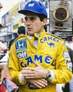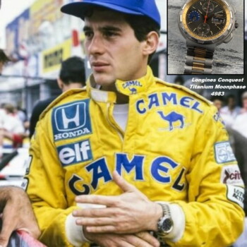 Senna continued to wear this Seiko while driving the ‘86 JPS Lotus 98T and ‘87 Camel Lotus 99T. Worn while winning the ‘87 Monaco Grand Prix, his first of six record wins at the Principality! But later in the ‘87 season Ayrton switched to a different watch, which this author believes to be a Longines Conquest Titanium Moonphase 4983 (70% certainty).