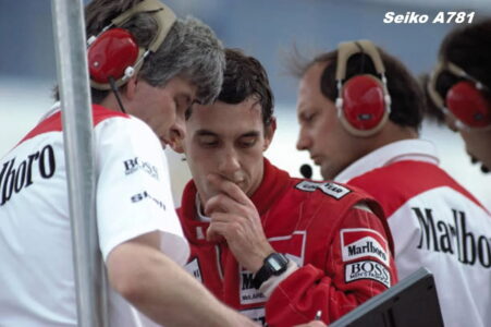 Senna wearing his Seiko A781 Racing Master in Suzuka Japan ‘88 (below), where he clinched his first world championship!