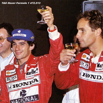 Knowing he had a good chance of clinching the title in Japan, was it Senna’s way of honoring the team by saying “I’m just like all the mechanics and crew that supported me” by wearing the same watch? Or was he paying tribute to Honda and Japan by wearing a red colored watch? Or had something happened to his S/el, necessitating a last-minute replacement watch to wear? Whatever the reason, this was the only occasion that Senna ever wore the red F1 Chrono 472.513 at a Formula 1 Grand Prix. But what an occasion it was, becoming his third world championship watch and showing prominently on his wrist as Senna celebrated with champagne on the podium!