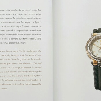 The production “6000 Senna” model was planned for an October 1994 launch, but Senna’s death delayed the project, some questioning whether it should even continue. Ultimately, the watch was released in the Spring of 1995, with a portion of the proceeds going to the then newly-formed Ayrton Senna Foundation to benefit charities around the world. Ayrton had specifically suggested the red “S” logo, checkered flag motif, and his favored leather strap as design elements of the watch.