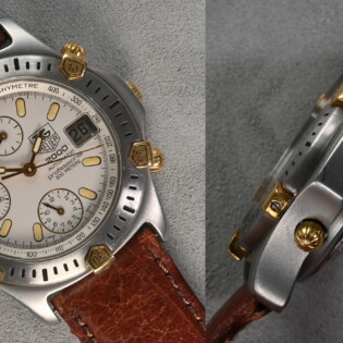 TAG Heuer offered these watches with white or black dials, in stainless steel cases and a bi-metallic version with gold for the bezel studs, as well as the crown and pushers. Ayrton seemed to favor two-tone watches, white or grey dials and brown leather straps. His Super 2000 pictured below (reference 165.806) is an example of his style and taste.