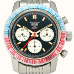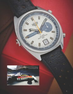 Todays’ collectors cherish the Heuer chronographs worn in the 1960s and 70s by racing heroes Mario Andretti, Jochen Rindt, Clay Regazzoni, Emerson Fittipaldi, Niki Lauda and Gilles Villeneuve, among many others. In addition to collecting the same models as were worn by the racing heroes (the “Rindt” Autavia, the “McQueen” Monaco, etc.), there are rare instances in which collectors are able to purchase the actual watches worn by racers or the old timing equipment that was used by racing teams.