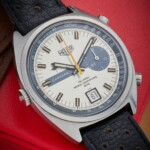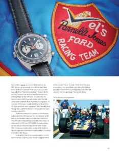 To celebrate the back-to-back championships in 1970 and 1971, the Vel’s Parnelli Jones team ordered a batch of Heuer Autavias (reference 1163), with the case-backs engraved to commemorate the championship seasons. The Vel’s Parnelli Jones Autavia being sold as Lot 119 in the Heuer Champions auction comes together with a coat that was issued to the VPJ team member who had received the watch.