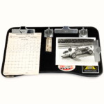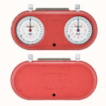 Each of these stopwatches has a three-function crown, with the first push starting the timing, the second push stopping the timing, and the third push returning the hands to zero. Using a pair of these stopwatches in a single holder would allow a team member or spectator to time a particular car, one lap after the next.