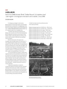 The Heuer Autavia (reference 2446) included in the Heuer Champions auction as Lot 110 commemorates the record-setting Zodiac Endurance Run, and was previously owned by John Maclay, who of the five drivers who drove the new car to its record results.
