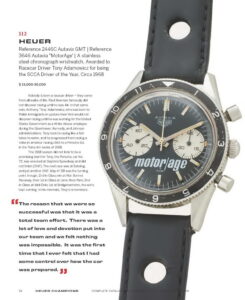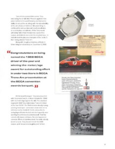 As Trans Am Driver of the Year, Adamowicz was awarded a Heuer Autavia chronograph, reference 3646, included in the Heuer Champions auction as Lot 112. The award was sponsored by Motor Age magazine, and the dial has the Motor Age logo across the bottom. Motor Age was a trade publication for independent automotive repair shops, and in the 1960s, the magazine sponsored awards in various series, including Indy Car, stock car racing and Trans Am.