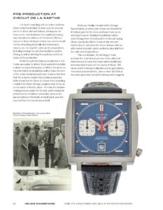Nunley or his prop team had shopped at local Le Mans area stores to be able to offer McQueen a variety of timepieces that would be suitable for Delaney. That table included watches and chronographs from Heuer, as well as from Bulova, Longines, Omega, Rolex and Tissot. In his first reaction, McQueen picked up one of the day’s most popular watches, an Omega Speedmaster. Nunley suggested that this would not be the ideal choice for two reasons — first, the Omega chronograph would create something of a mismatch, as Delaney’s racing suit would have a very prominent red and white Heuer patch, and second, with the sudden popularity of the Speedmaster after the 1969 moon landing, people watching the film might assume that McQueen was being sponsored by Omega.