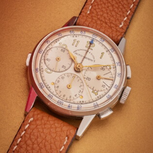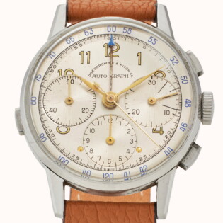 The present watch is a first-execution Auto-Graph chronograph, produced only in 1953, and is distinguished by its over-sized recorders and large gold-painted Arabic numerals, both features designed to deliver optimal legibility during the rigors of racing or rallying.