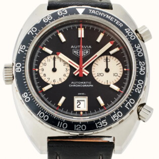Heuer introduced its Autavia chronograph in 1962, with defining features being an oversized waterproof case, large white recorders on black dials, and a rotating bezel that provided additional timekeeping options. These bezels were marked for either hours, minutes or decimal minutes, allowing the enthusiast to select the chronograph to suit their specific timing needs (hours for world travelers, minutes for divers, etc.)