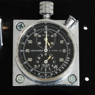 The Heuer timers are the easy part of the story, a matching pair of Autavia dashboard timers from the late 1950s, co-branded with Abercrombie & Fitch, the retail store and mail order supplier that offered top-quality gear to the world’s leading adventurers. The Autavias had 12-hour stopwatch capacity; this version had the tachymeter scale printed on the dial, so that racers could convert elapsed time over a measured distance to miles per hour.