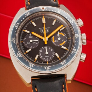 All this changed, however, circa 1972, when Heuer introduced a new range of manual-winding Autavia chronographs, along with some new automatic models (Calibre 15). Although housed in the same type of C-shaped case as the automatic models, Heuer moved beyond the “black and white” that described the first decade of Autavias, and beyond the traditional styles of hands and markers, to a new range that would capture the bold style of the 1970s. Markers might be painted on the dial, in either sticks or Arabic numerals; hands could be painted bright white; numerals might be placed radially on the dial; lume could be shaded green or a rich amber. It was the 70s, and enthusiasts wanted more than “black and white”.