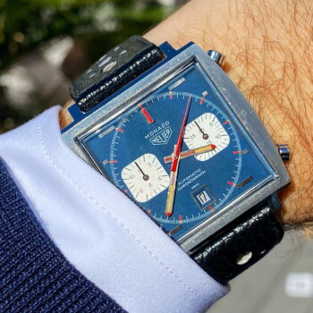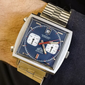 11. Monaco, reference 1133, with blue, black and red test dial – Morgan King had the craziest looking watch on the table, and 50 years later we can only wonder why Heuer never pushed the button to put it into production. If you have to have one, Bamford Watch Department can give you one with a similar look.