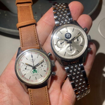 69. Carrera 45, reference 3647T, first execution, with “Shamrock Oil” logo and the name “Paul Copp” printed on the dial (1964) – Vintage Heuer collectors love the mysteries, and the “Shamrock Oil” and “Paul Copp” printed on the dial have yet to be explained. Paul Capps was an executive of Shamrock Oil, but why did they have this dial printed for him. Yes, we love the mysteries!