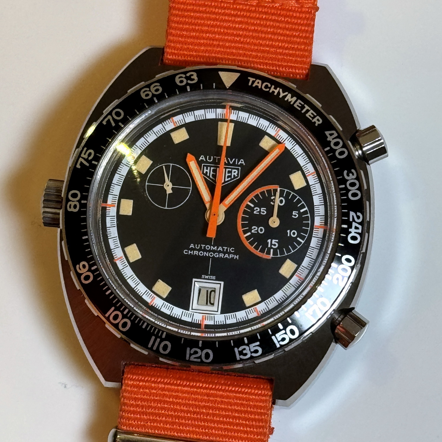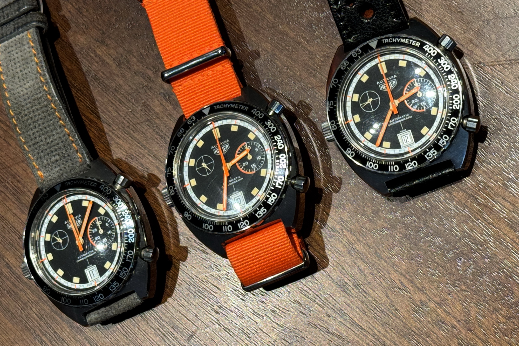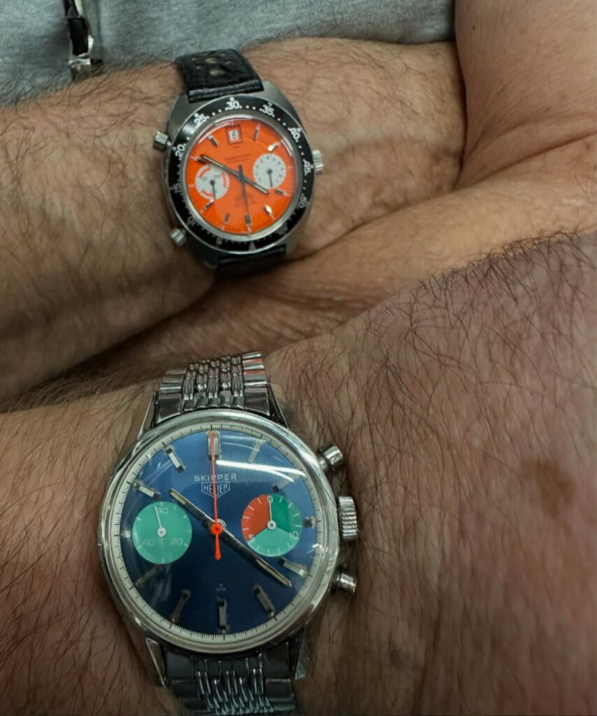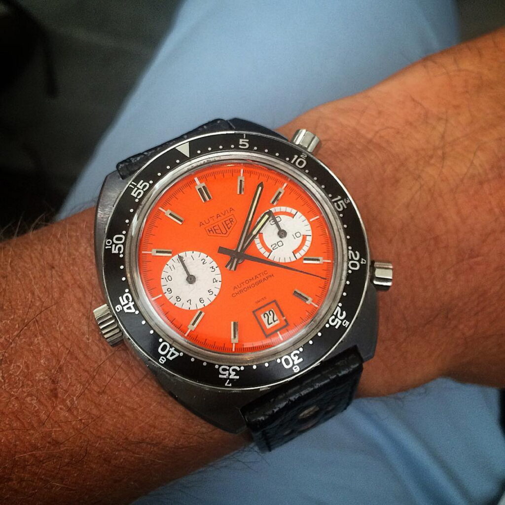 7. Autavia, reference 1563, “Exotic” dial (1972) – We had three of these on the table, but this was the only one on an orange NATO strap. Collectors recall an earlier Summit when Morgan King went home with a carry-on full of these watches.