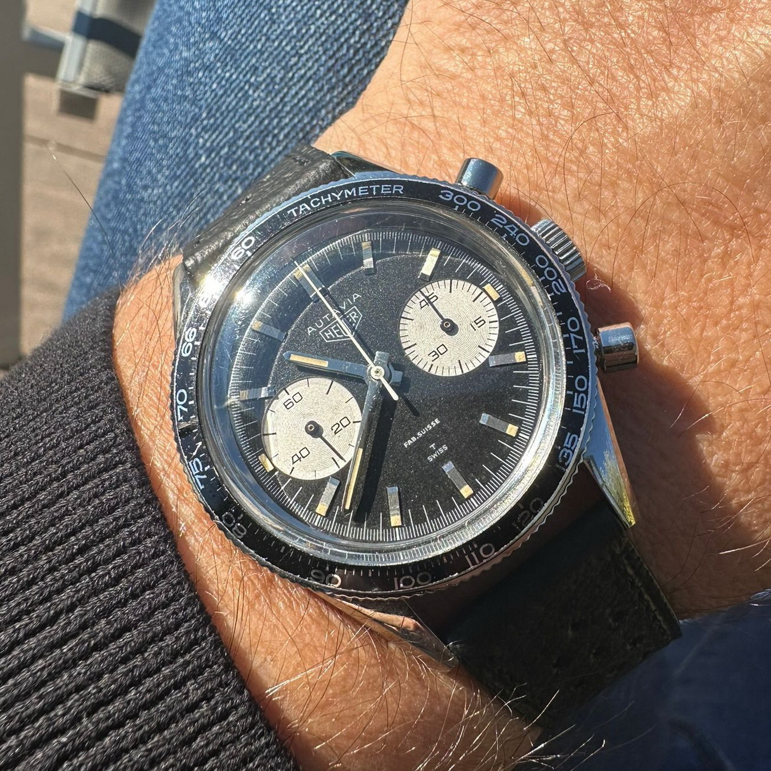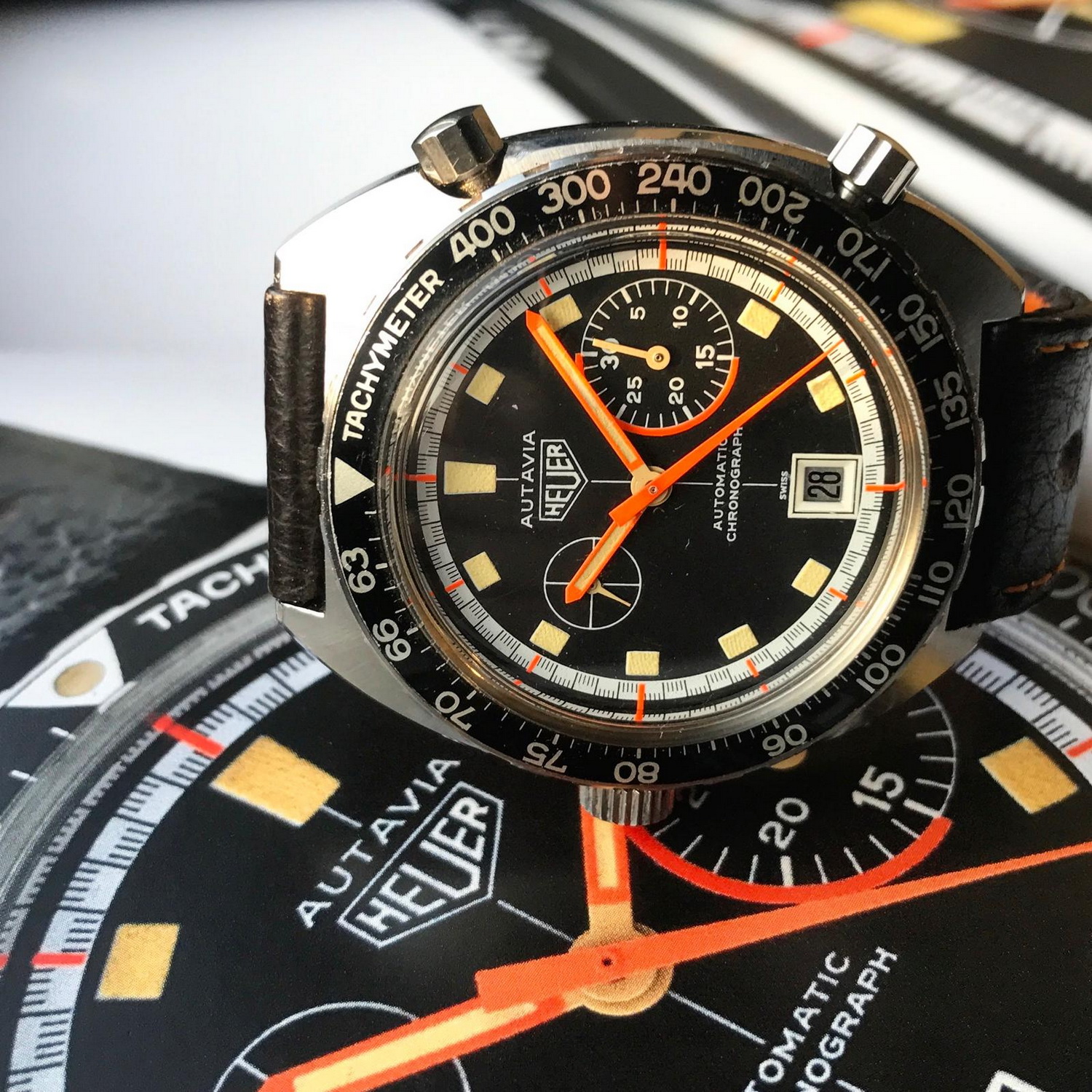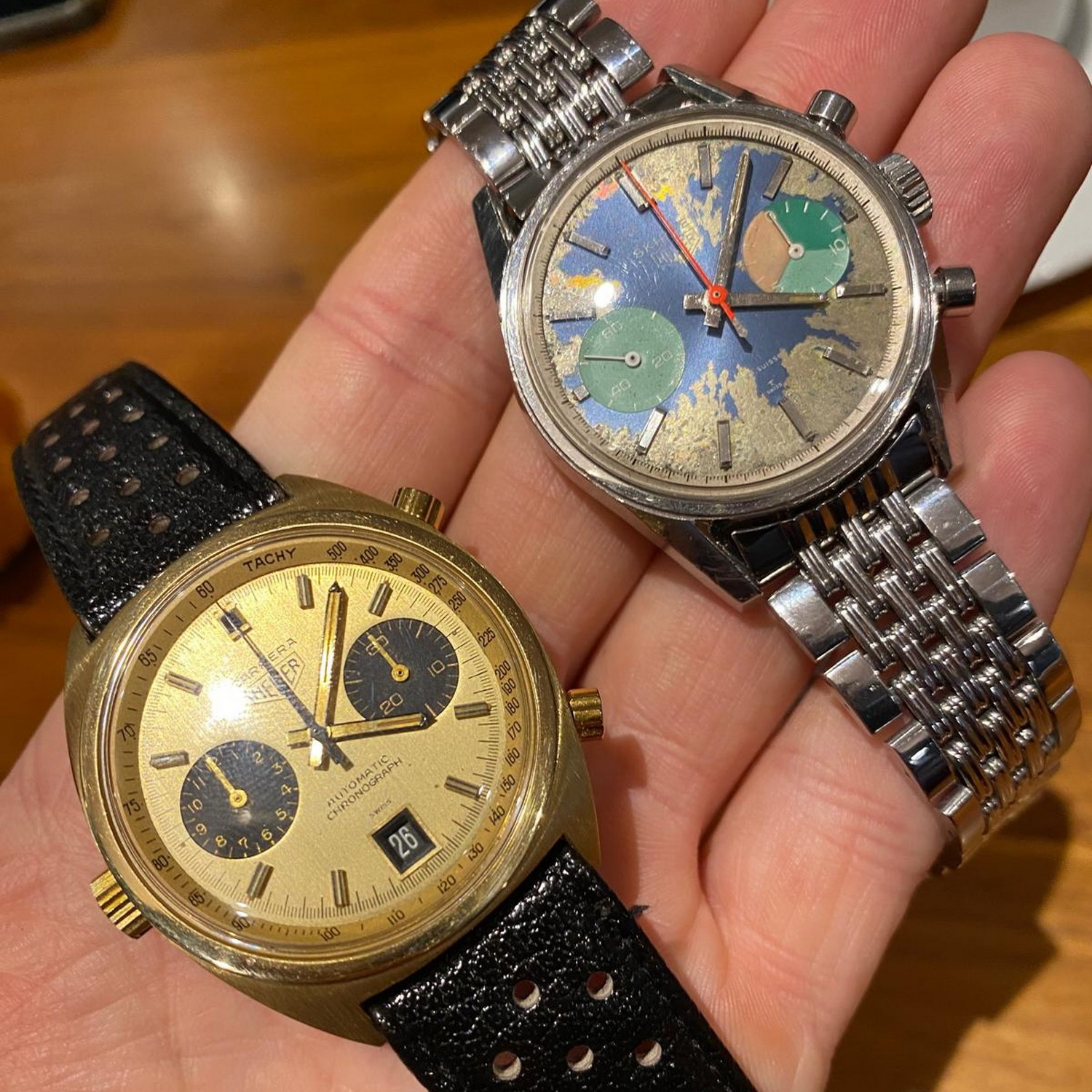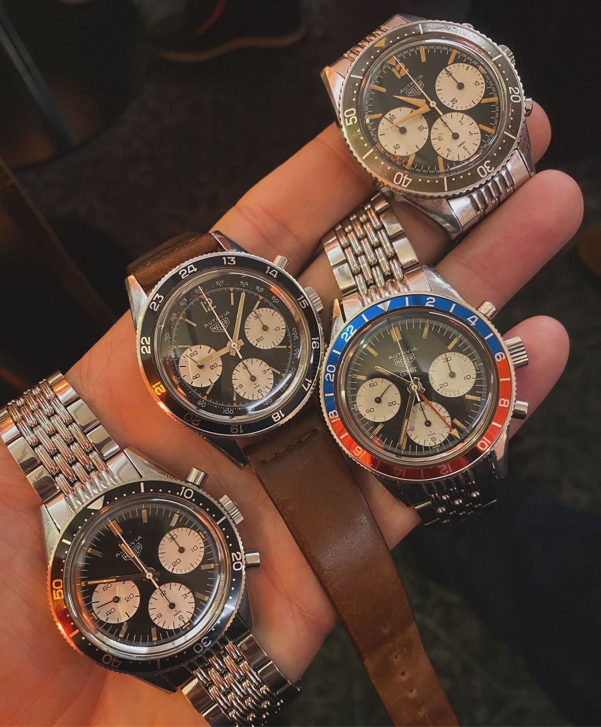 71. Autavia, reference 1563, “Exotic” dial (1972) – There were three on the table; this one looks great on the perforated racing strap.