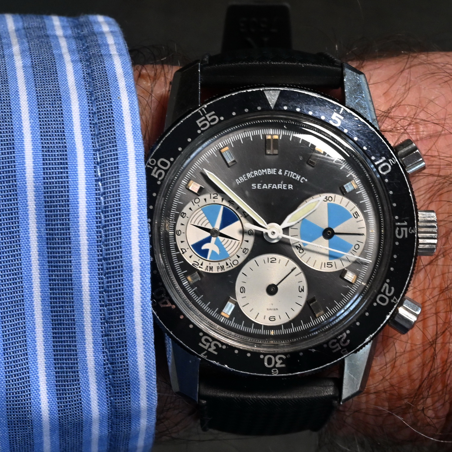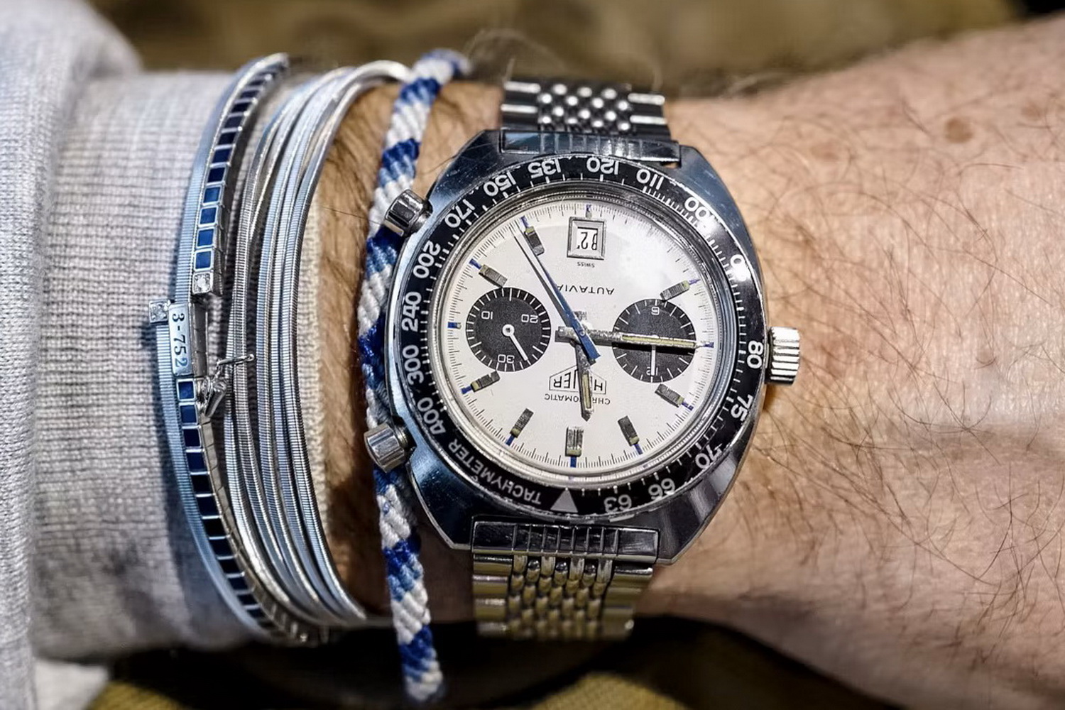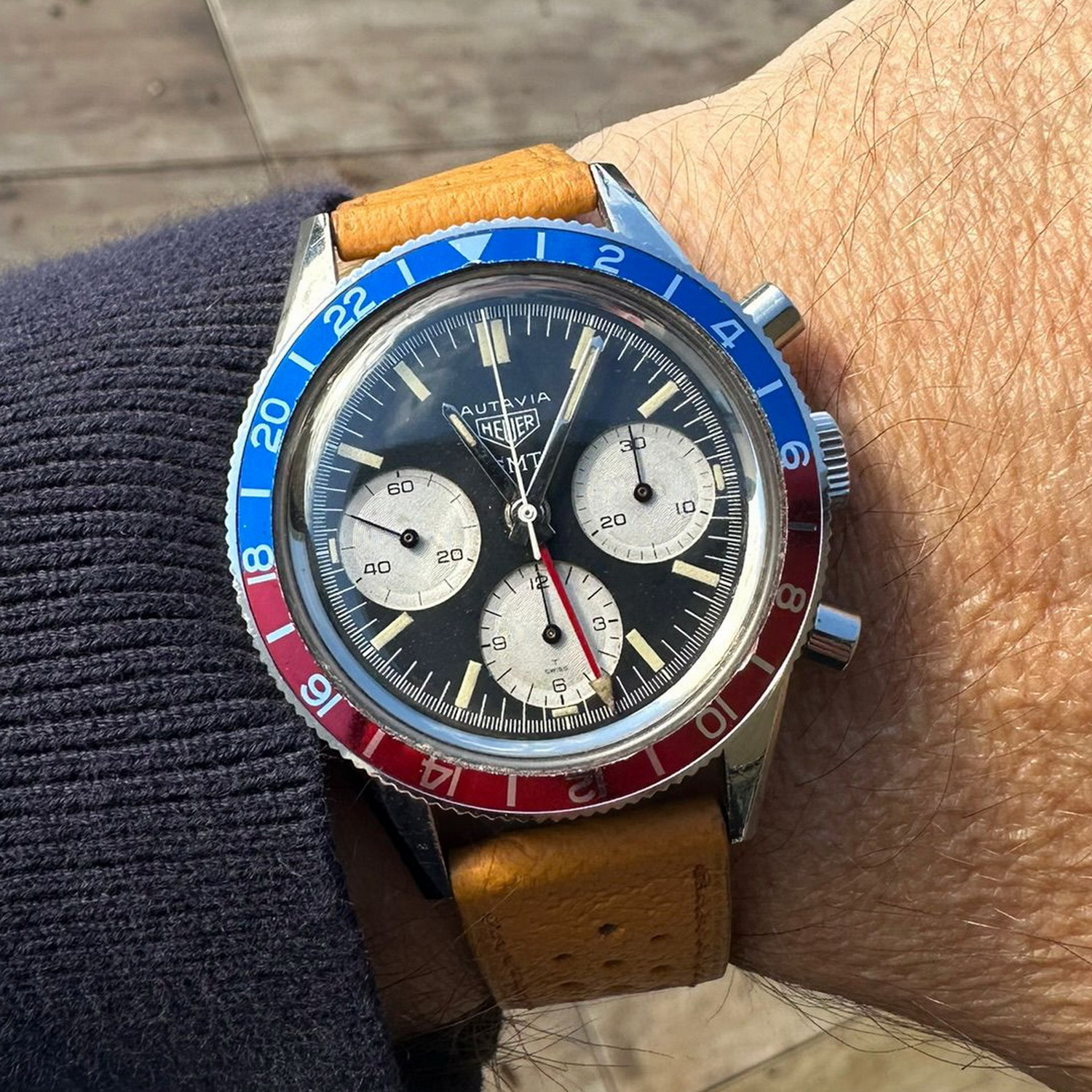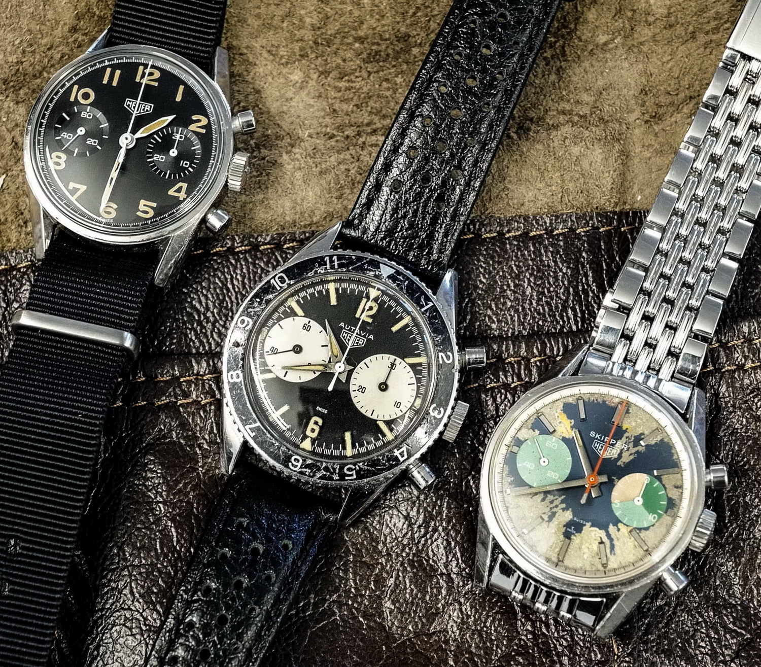 71. Autavia, reference 1563, “Exotic” dial (1972) – There were three on the table; this one looks great on the perforated racing strap.