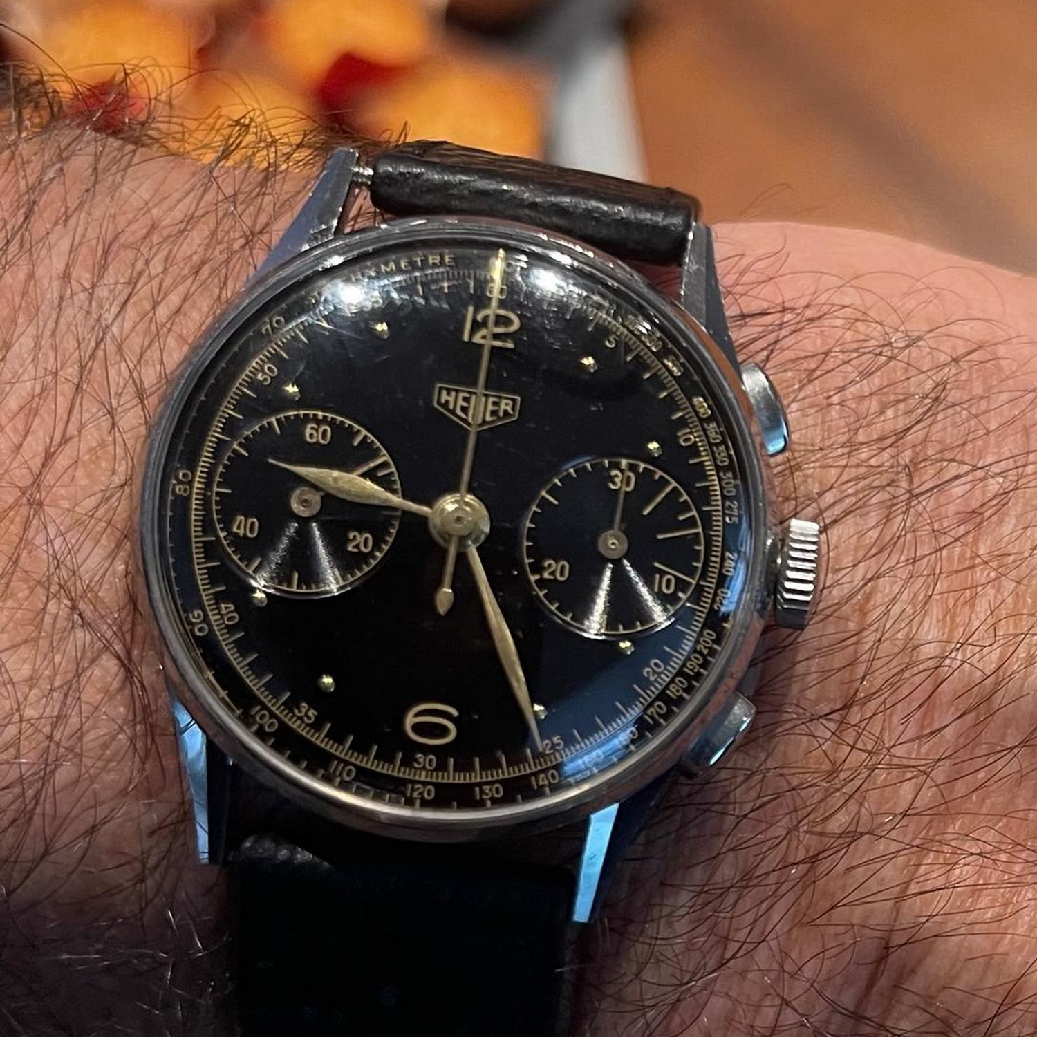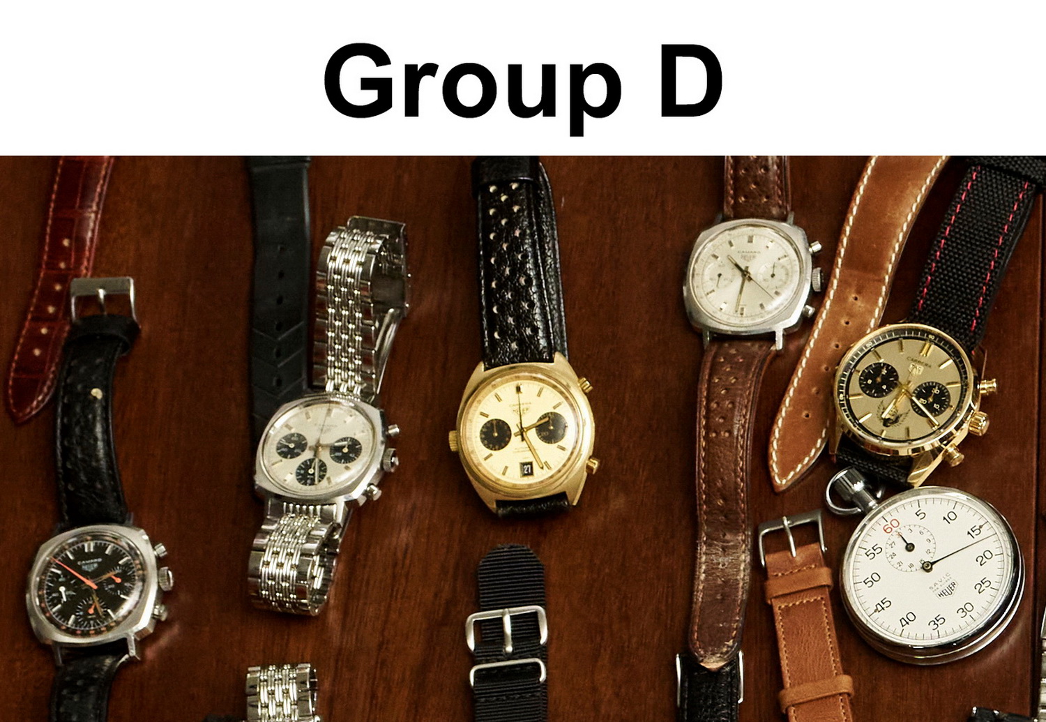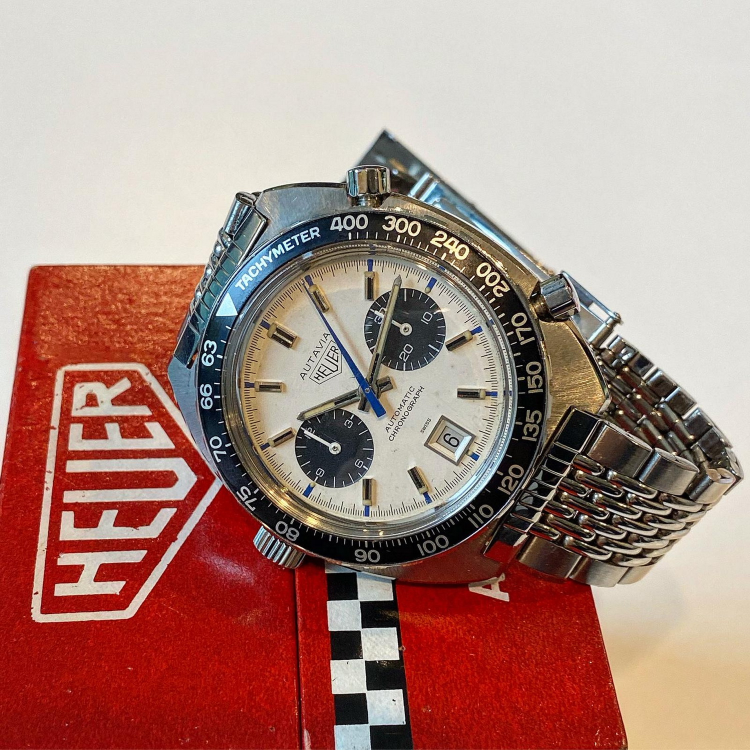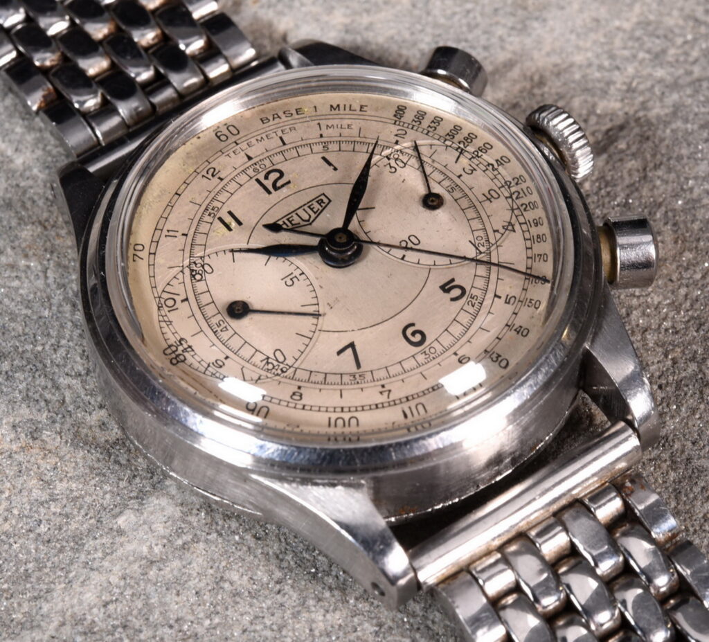 37. Reference 901 stopwatch, co-branded “SAVIC” — Made for Société Anonyme de Vente Industrielle de Compteurs, Heuer’s French importer. There had to be at least one stopwatch on the table, and this one with the SAVIC branding adds a twist.