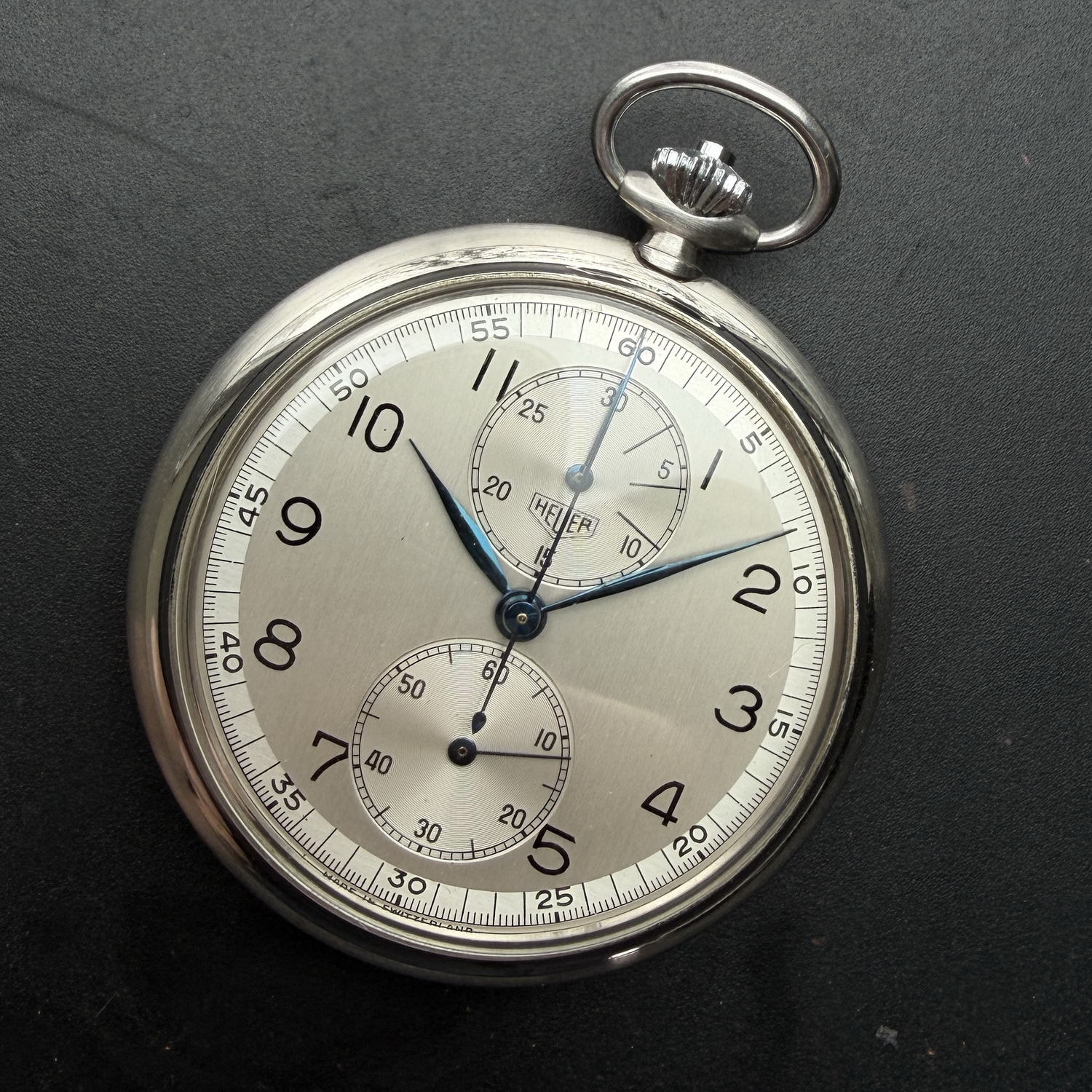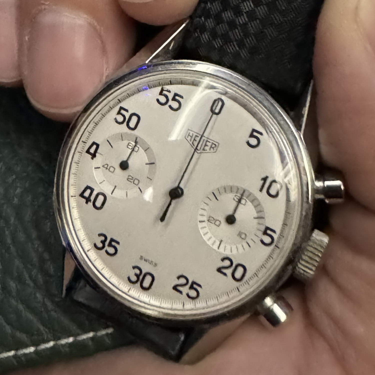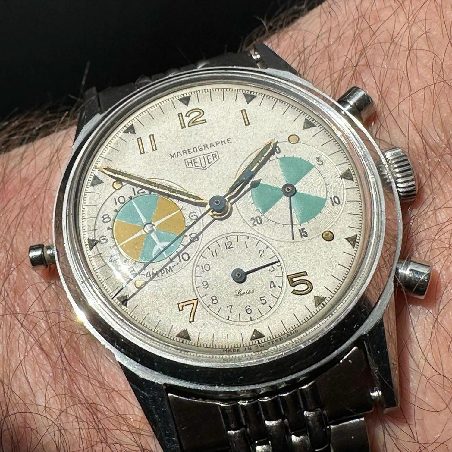 37. Reference 901 stopwatch, co-branded “SAVIC” — Made for Société Anonyme de Vente Industrielle de Compteurs, Heuer’s French importer. There had to be at least one stopwatch on the table, and this one with the SAVIC branding adds a twist.