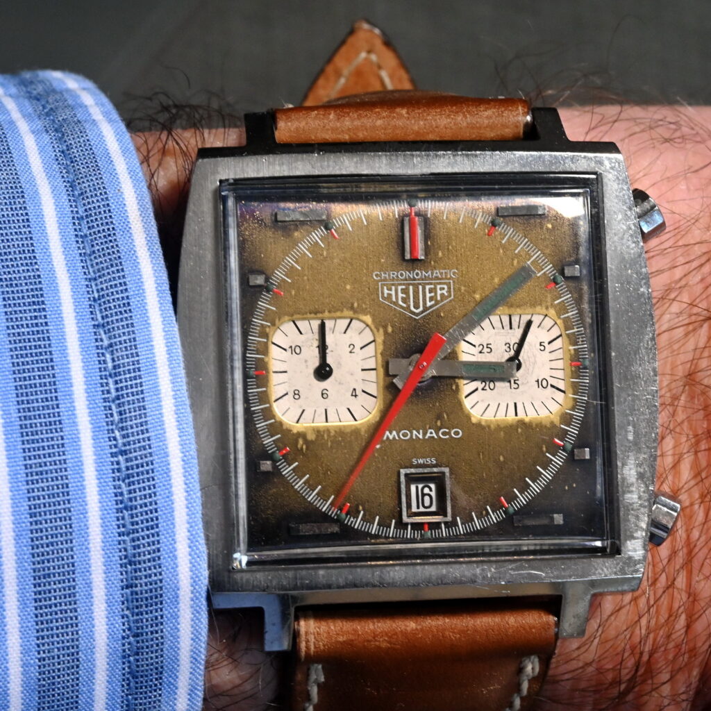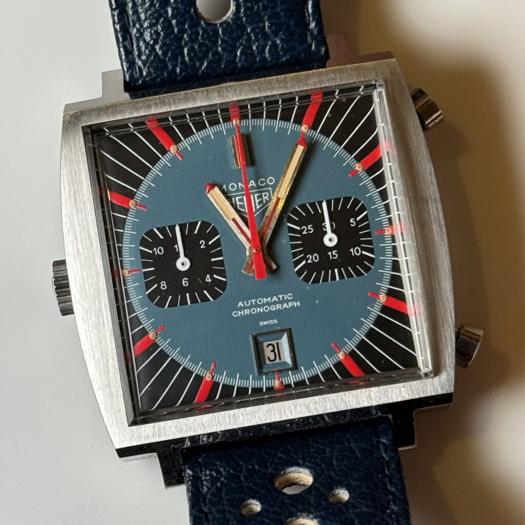 10. Monaco, reference 1133 B (blue dial) “Chronomatic” (1969) — collectors call it the “Paintless Wonder”, because it left the factory with midnight blue paint, but not much of it remains. The name “Chronomatic” across the top of the dial tells us that this is a very early Monaco.