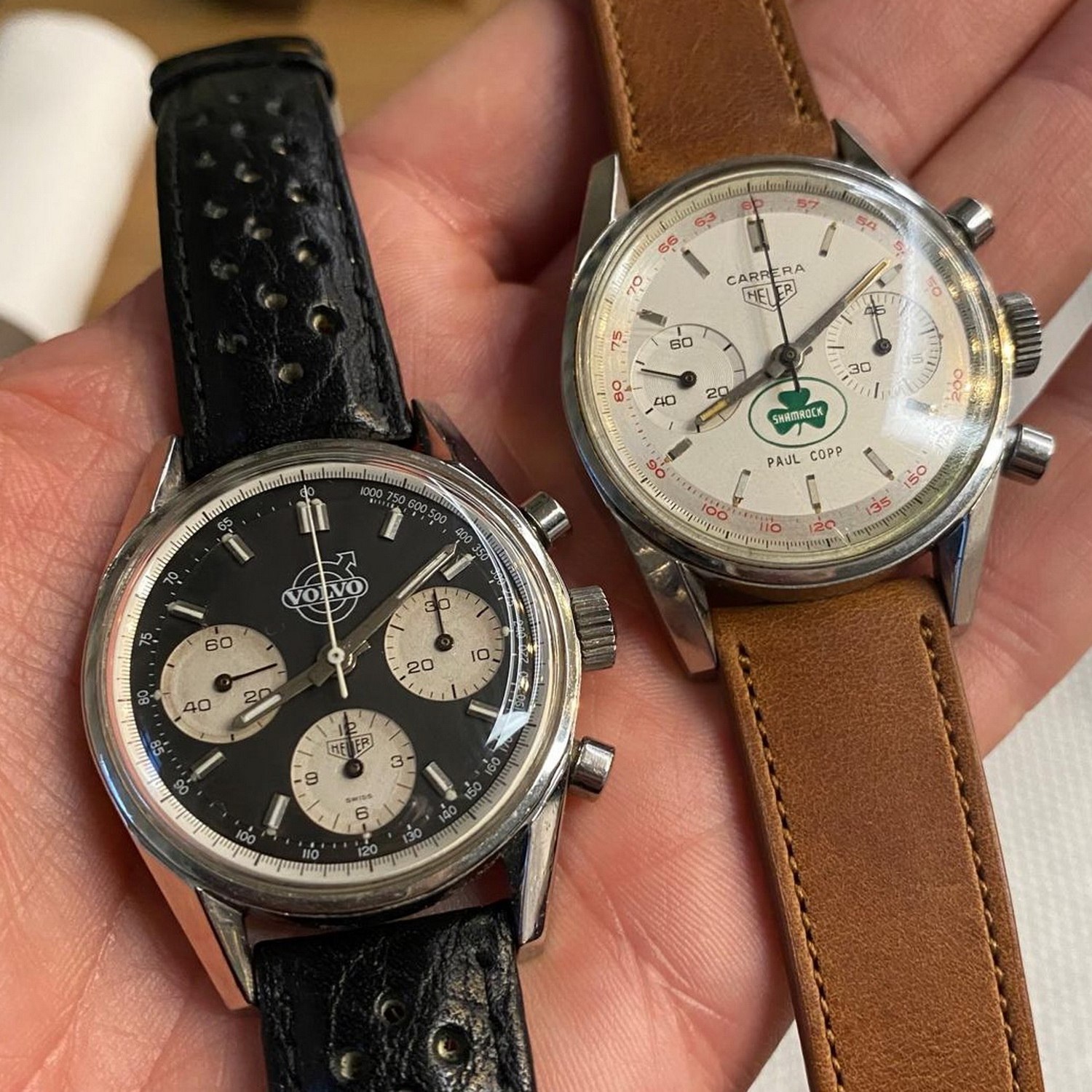 14. Carrera, reference 2447 NST, with “Volvo” logo (1970) — A “reverse panda” Carrera with a tachymeter scale on dial; a fine representative of the vintage Heuers with third-party logos on the dial