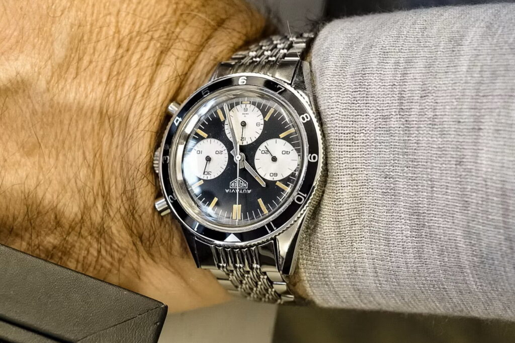 61. Autavia, reference 3646 M (1968) — The second execution case with the third execution dial is the one Mario Andretti wore; this one has the minutes bezel. We had “Andretti” Autavias on the table, fitting for F1 World Champion who was also Indy 500 winner.