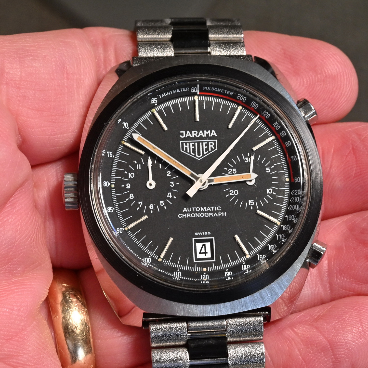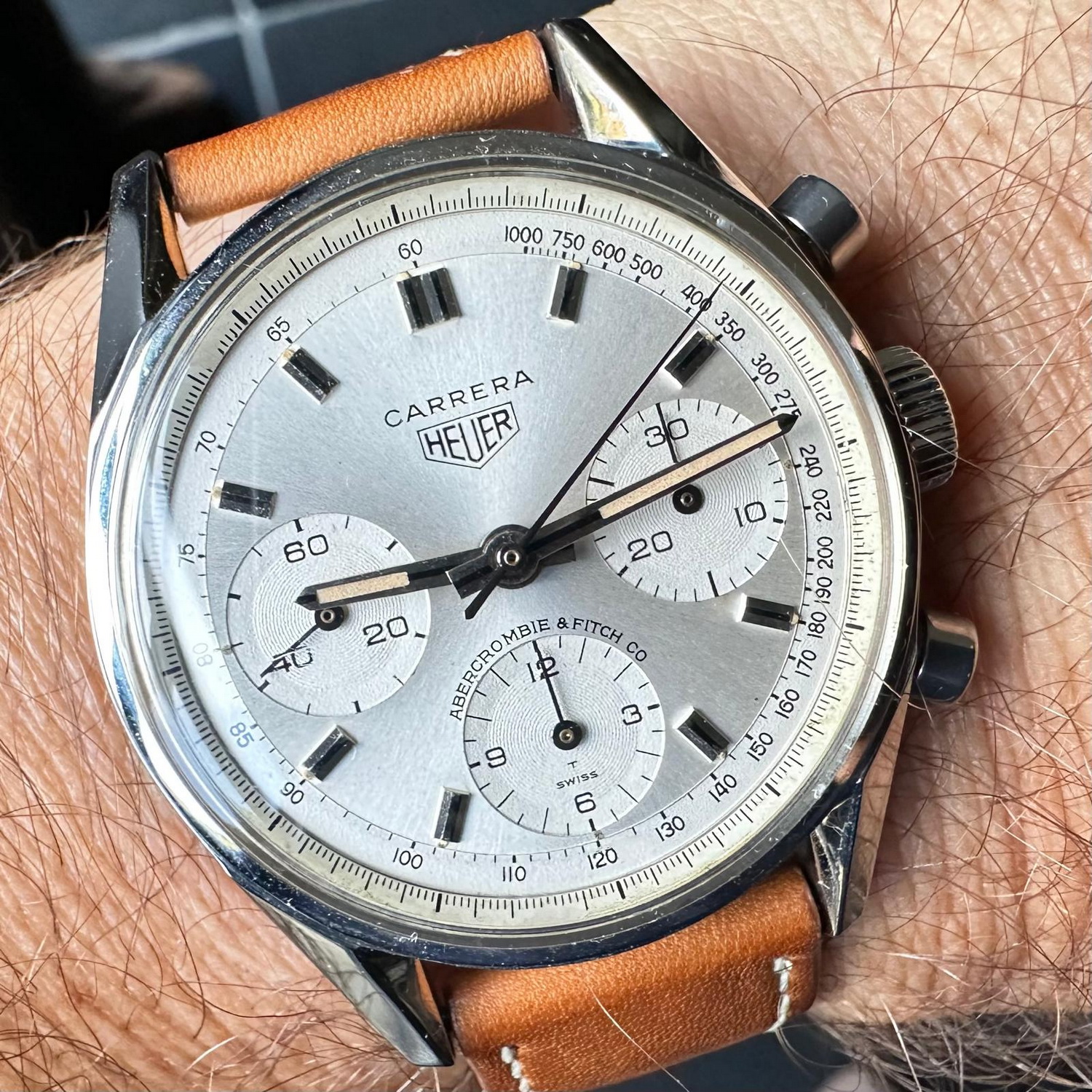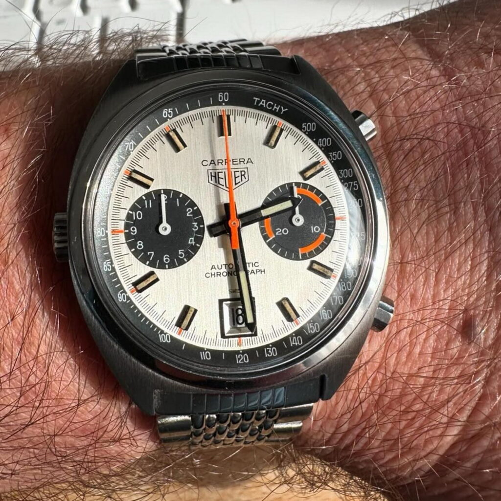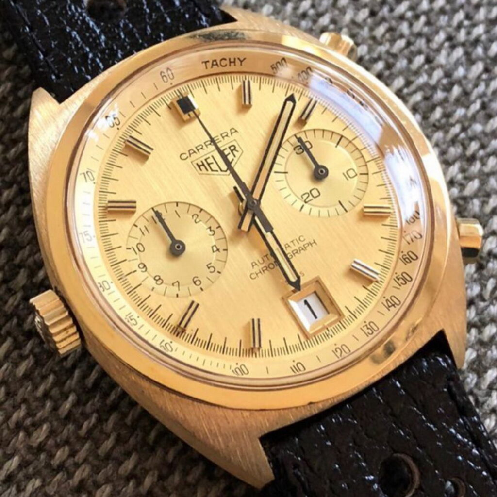 51. Carrera, reference 1158 CH, second execution (1972) — The “CH” tells us that this one has a champagne dial; second execution means that it has numerals 1-through-12 on hour recorder; as worn by Mario Andretti.