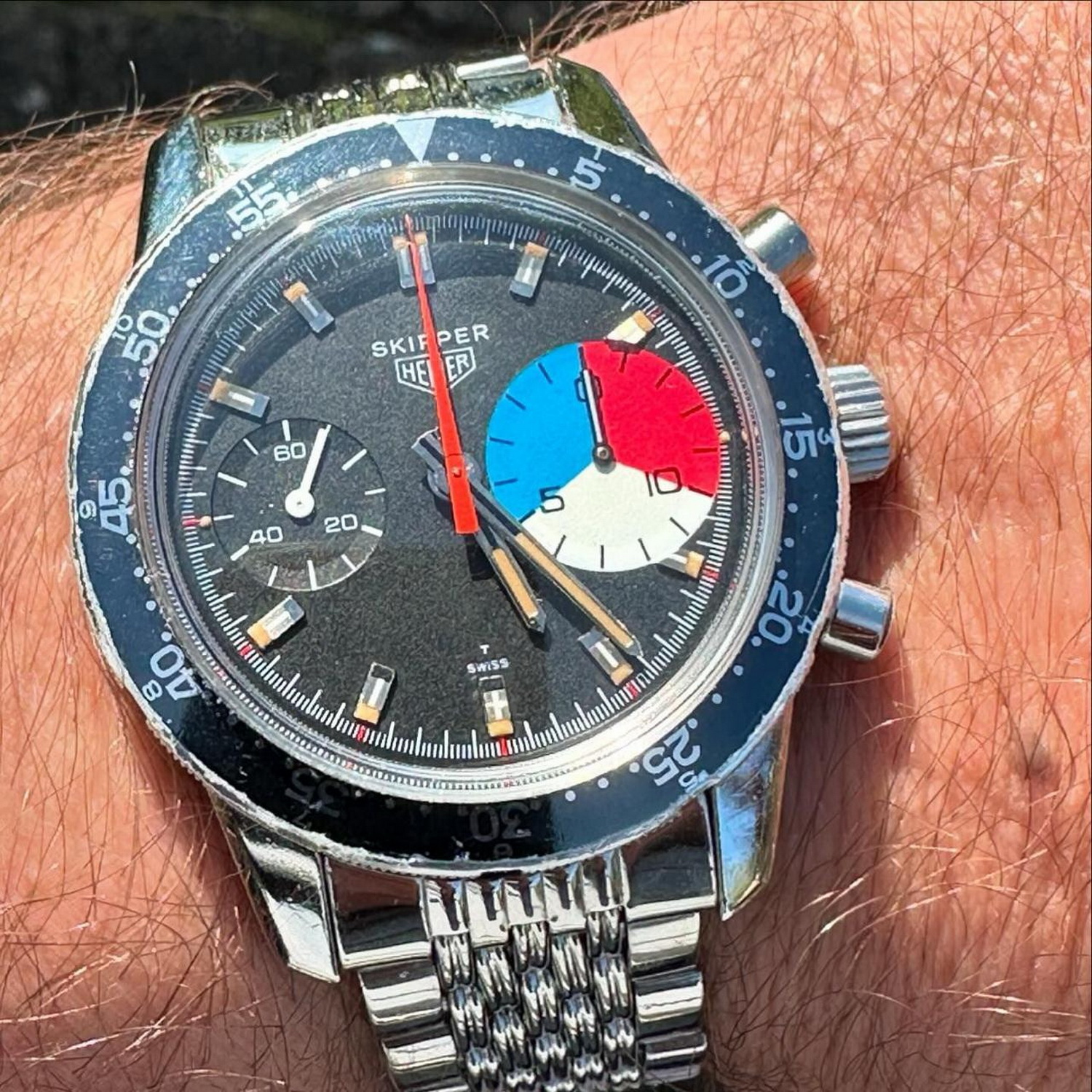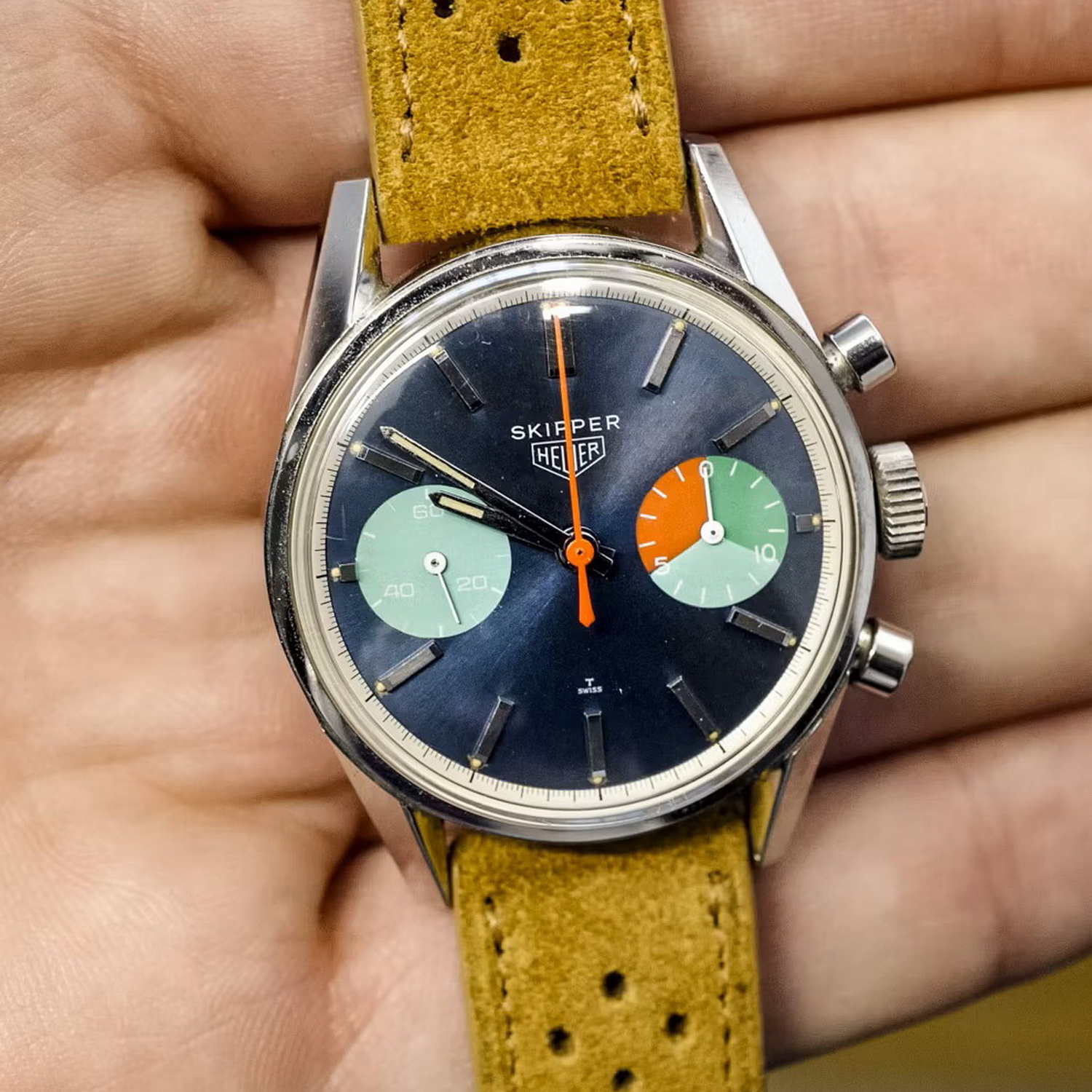 72. Skipper, reference 7754, “Skipperrera” (1968) – Most of the Skipperrreras have some paint loss on the dial; we can describe this watch by saying that some paint remains on the dial . . . but not much.