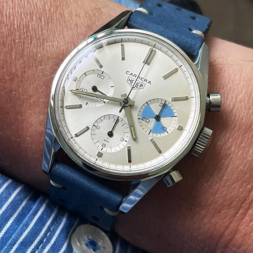 74. Abercrombie & Fitch Seafarer, reference 2447 (1963) – There are over a dozen versions of the Seafarer / Mareographe / Solunagraph, and if you ask vintage Heuer collectors to name a favorite version, this one probably wins. The blue and white colors of the Seafarer dial look perfect in the Carrera case.