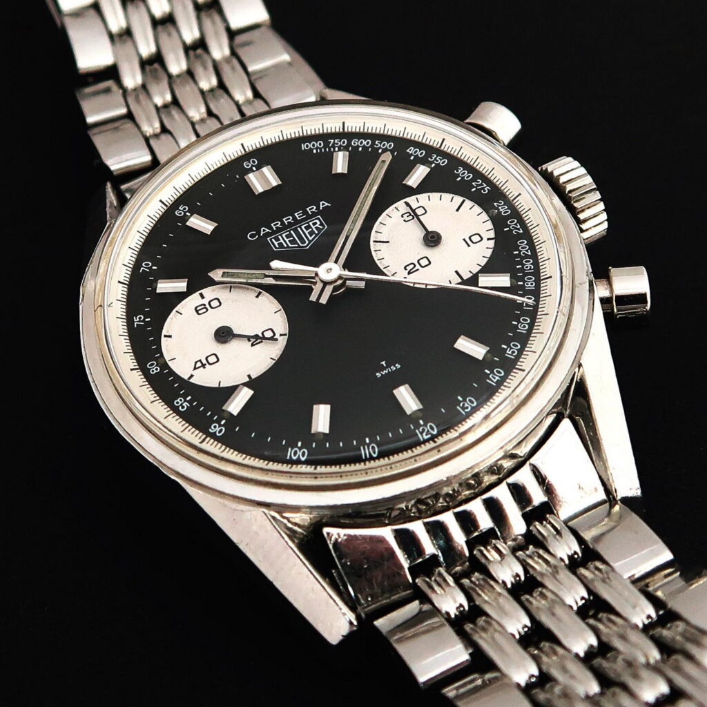 12. Carrera, reference 2447 NST (1970) — Around 1970, Heuer began offering contrasting registers on the Carrera chronographs. This “reverse panda” with the tachymeter scale on the dial was the version worn by James Hunt, who won the 1976 Formula 1 World Champion, driving for McLaren.