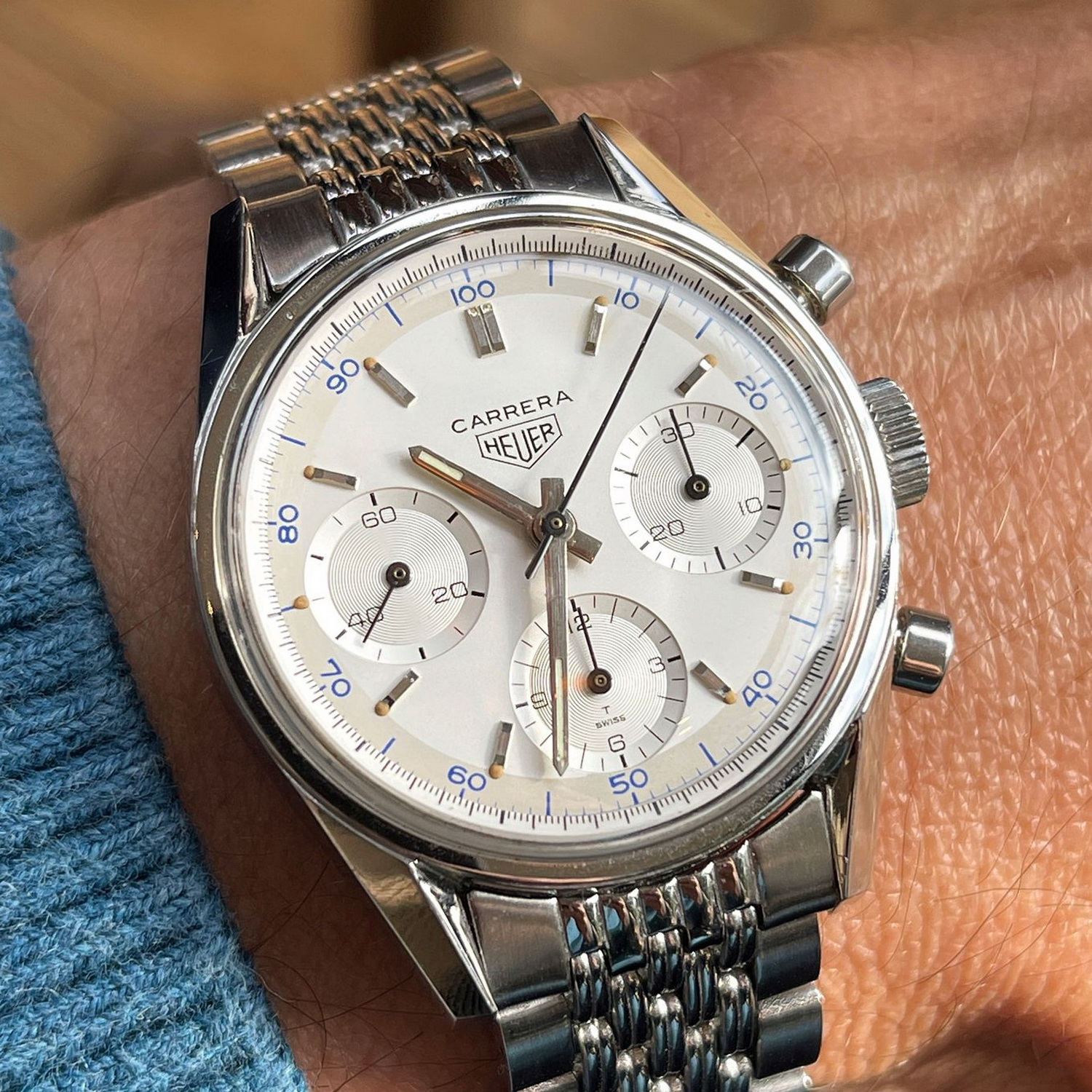 18. Carrera, reference 2447 S, first execution, on bracelet (1963) – In the beginning, there was the Carrera, a three-register Carrera with thin hands and thin markers on the dial.