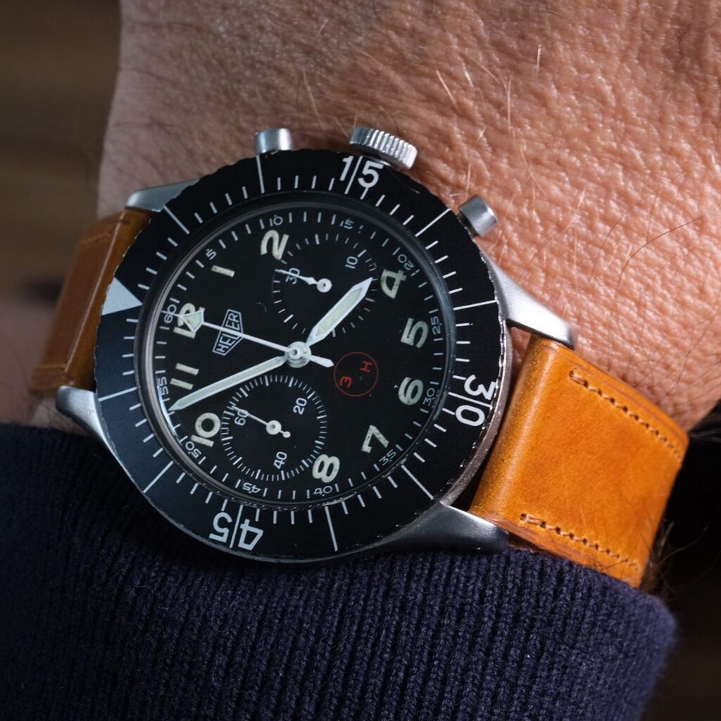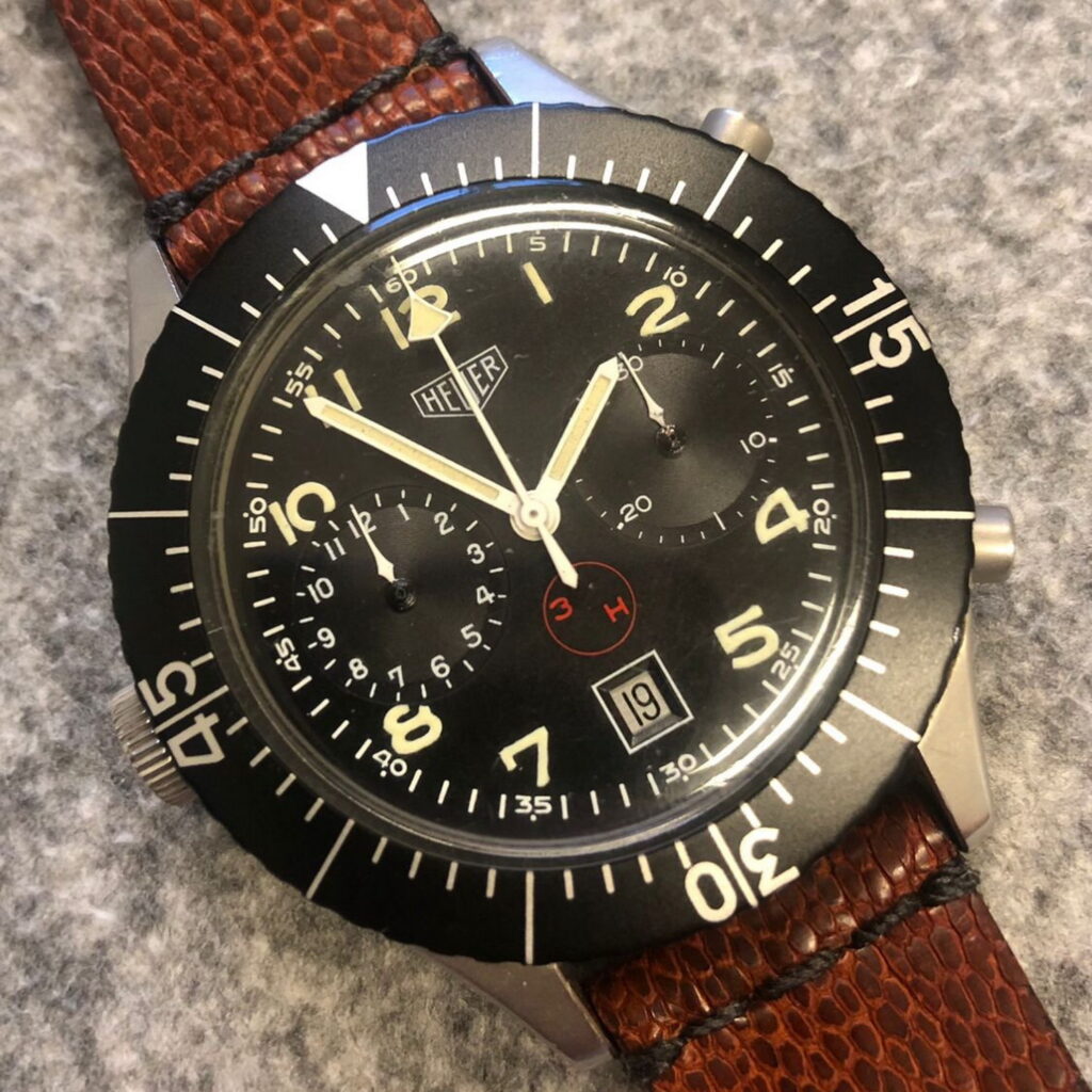 8. Reference 510.543 AMI chronograph (1982) — Heuer made these for the Aeronautica Militare Italiana (AMI), the Italian Air Force, and many collectors consider it the best of the Lemania-era chronographs.
