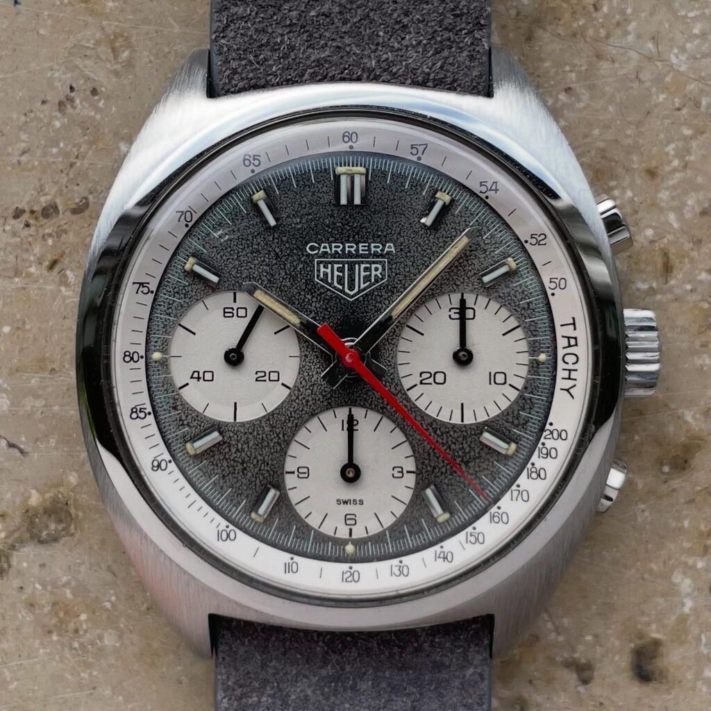 56. Carrera, reference 73653N, first execution (1970) — The 1970s Carreras with manual movements often don’t get much attention; this charcoal gray dial has aged to capture the look of the Milky Way.