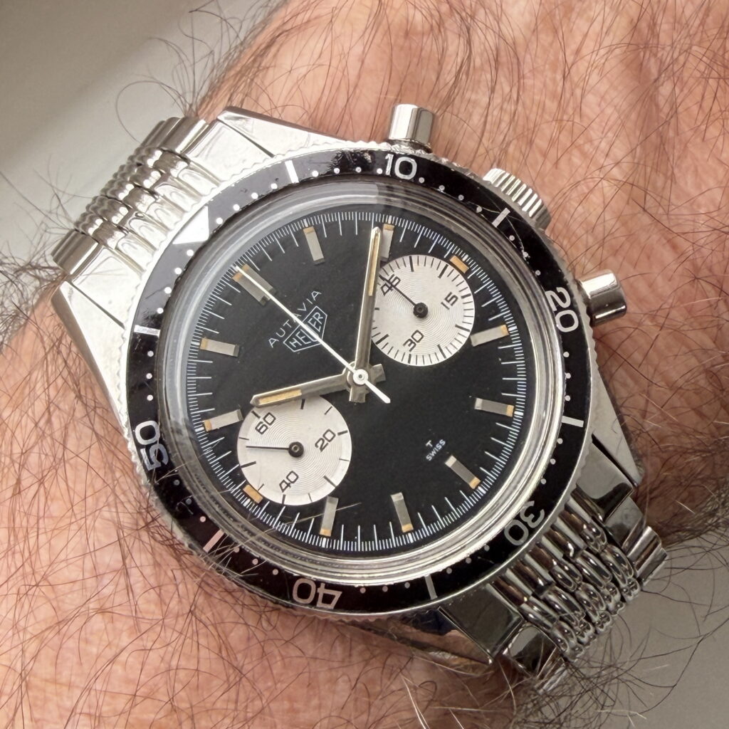 29. Autavia, reference 1163 “Viceroy” (1972) — Offered in a promotion with the Viceroy cigarette brand, this $88 version of the Autavia had brushed steel hands, with red and luminous inserts and red tips; the hour recorder had numerals 1 through 12; the bezel had a Tachymeter scale. So glad that someone thought to bring a “Viceroy” to the Summit; it’s hardly a Heuer gathering without at least one.