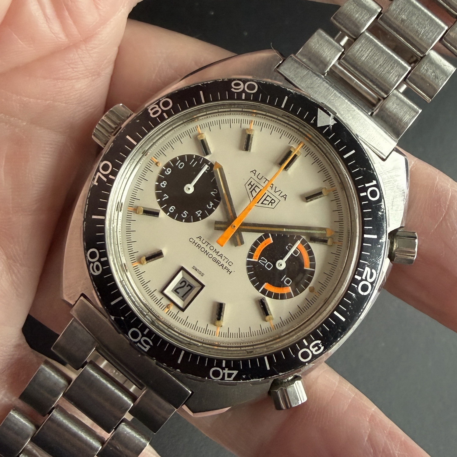 62. Autavia, reference 1163, “White Orange Boy” — This version of the Autavia has cream dial with black registers and orange accents; a nice companion to the far more common black-dialed “Viceroy” reference 1163. The watch shown here has the very rare decimal minutes bezel and also the “German” Heuer bracelet, which has a micro-adjustment.