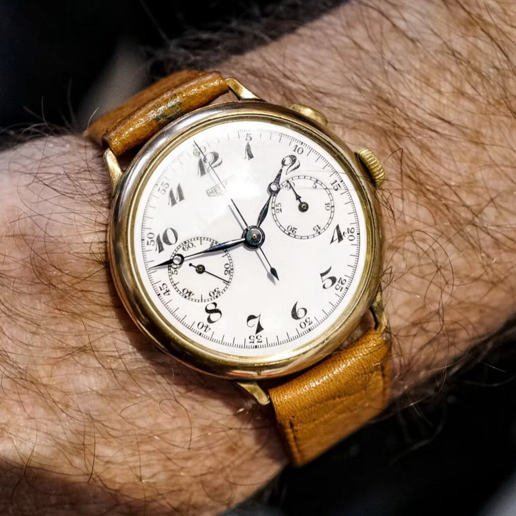 9. Reference 2406 chronograph, waterproof case (1942) – Heuer used the Landeron 13 movement from 1935 to 1945. With its white dial and colorful tachymeter and telemeter scales, this one is my candidate for the best looking chronograph .