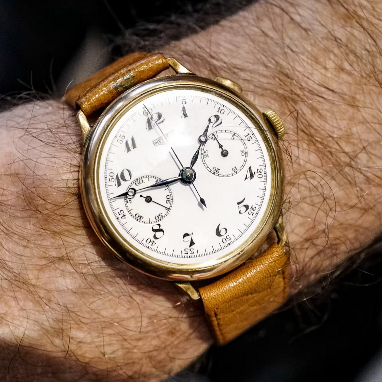 64. Gold-plated chronograph, with Valjoux 22 movement (1935) – This gold-plated model was a fine way to represent the 1930s Heuer chronographs.