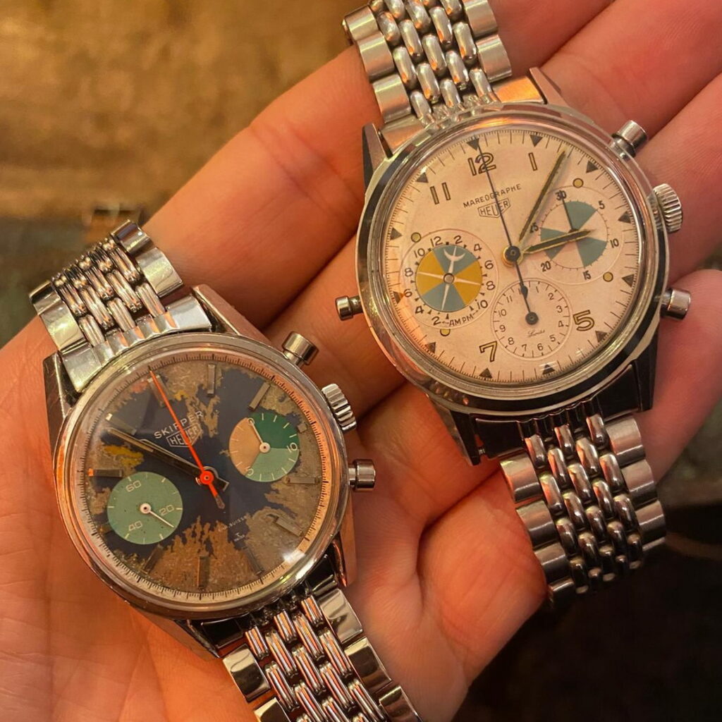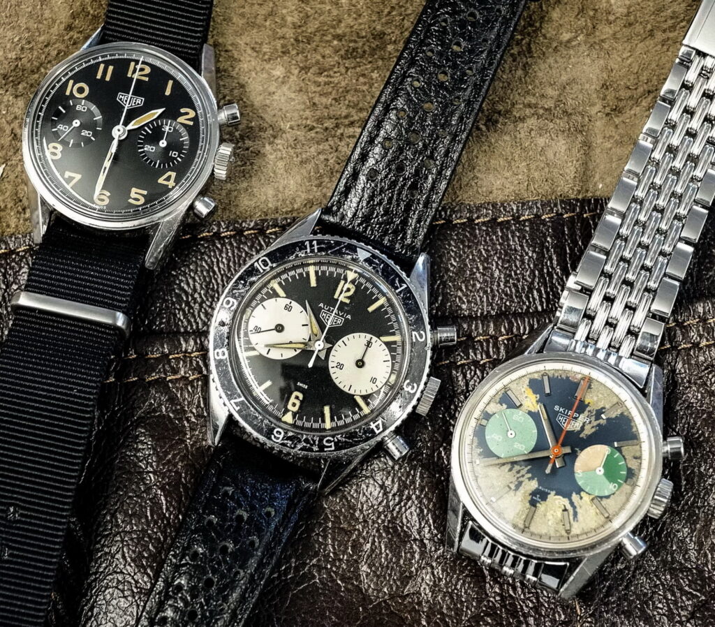 1. Triple calendar watch, white dial (1950s) – During the 1950s, the Heuer catalog was fairly well balanced, between chronographs and “three-hand” watches. By 1960, Heuer would go all-in on the chronographs, no longer offering three-hand or even calendar watches. It was nice to see this calendar watch on the table, representing a strategy that Heuer pursued 70 years ago.