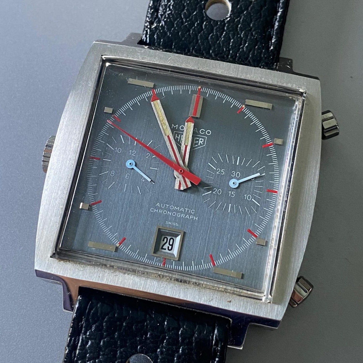 68. Monaco, reference 1133 G, first execution (1972) – On the first execution of the gray automatic Monaco, both the dial and registers are a metallic gray; the second execution would have darker registers.