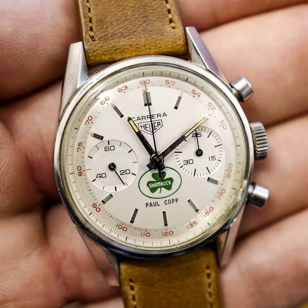 69. Carrera 45, reference 3647T, first execution, with “Shamrock Oil” logo and the name “Paul Copp” printed on the dial (1964) – Vintage Heuer collectors love the mysteries, and the “Shamrock Oil” and “Paul Copp” printed on the dial have yet to be explained. Paul Capps was an executive of Shamrock Oil, but why did they have this dial printed for him. Yes, we love the mysteries!