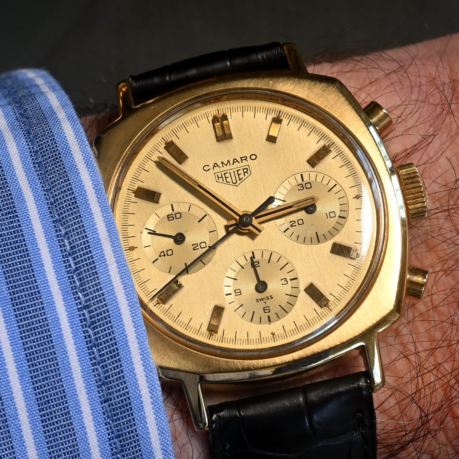 70. Camaro, reference 7228, 18 karat gold case (1968) – Most of the Camaros are stainless steel; a few are gold-plated; and a handful are 18 karat gold. The Camaro looks great with the champagne dial in the gold case.