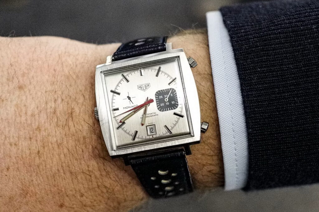 84. Monaco, reference 1533G (1972) — Heuer produced the Calibre 15 Monaco with two different dials, midnight blue, and this one in a silver / gray.