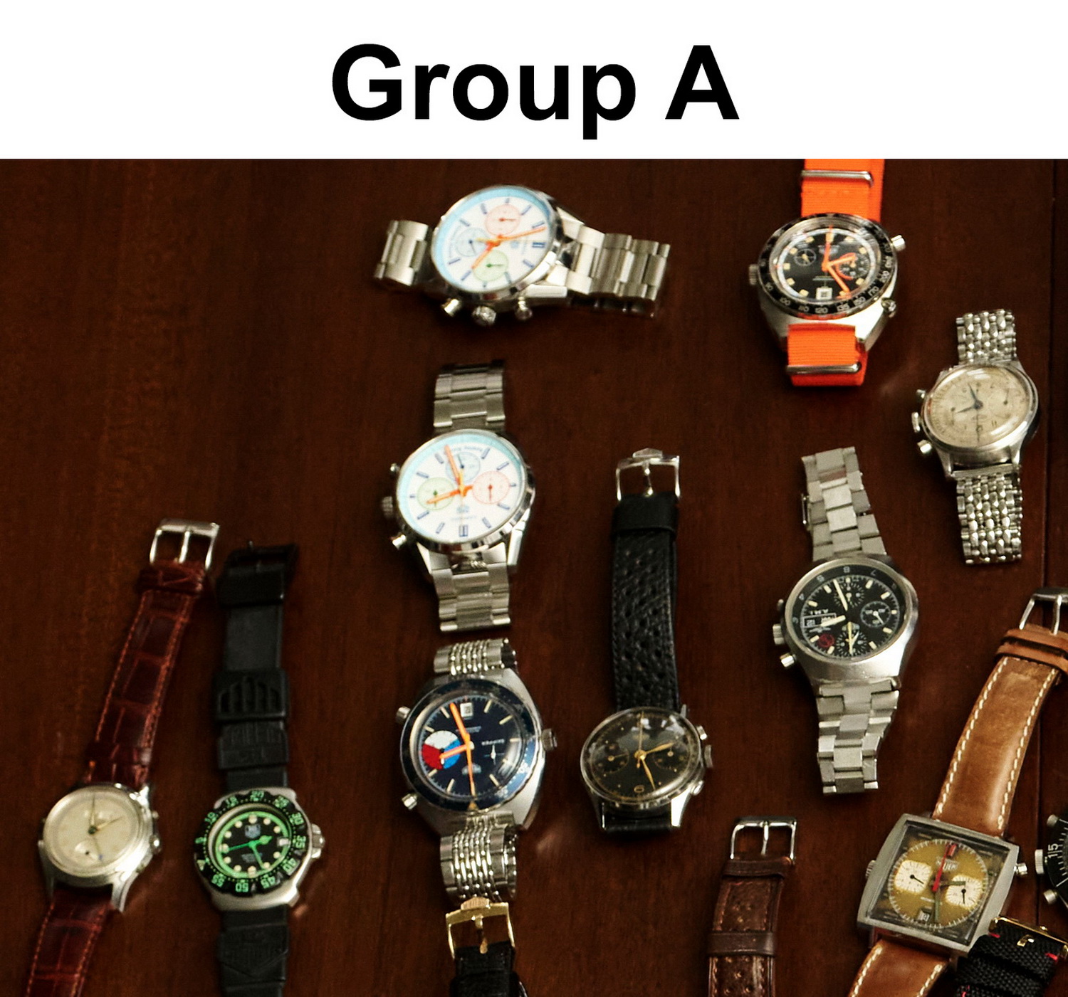In order to be able to identify and discuss each of the 90 watches that were on the table at the Summit, I took the best photo of the and divided it into nine groups, as shown below.