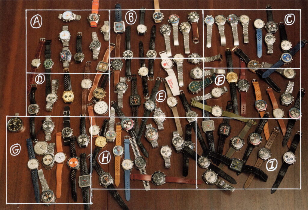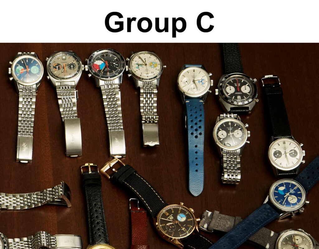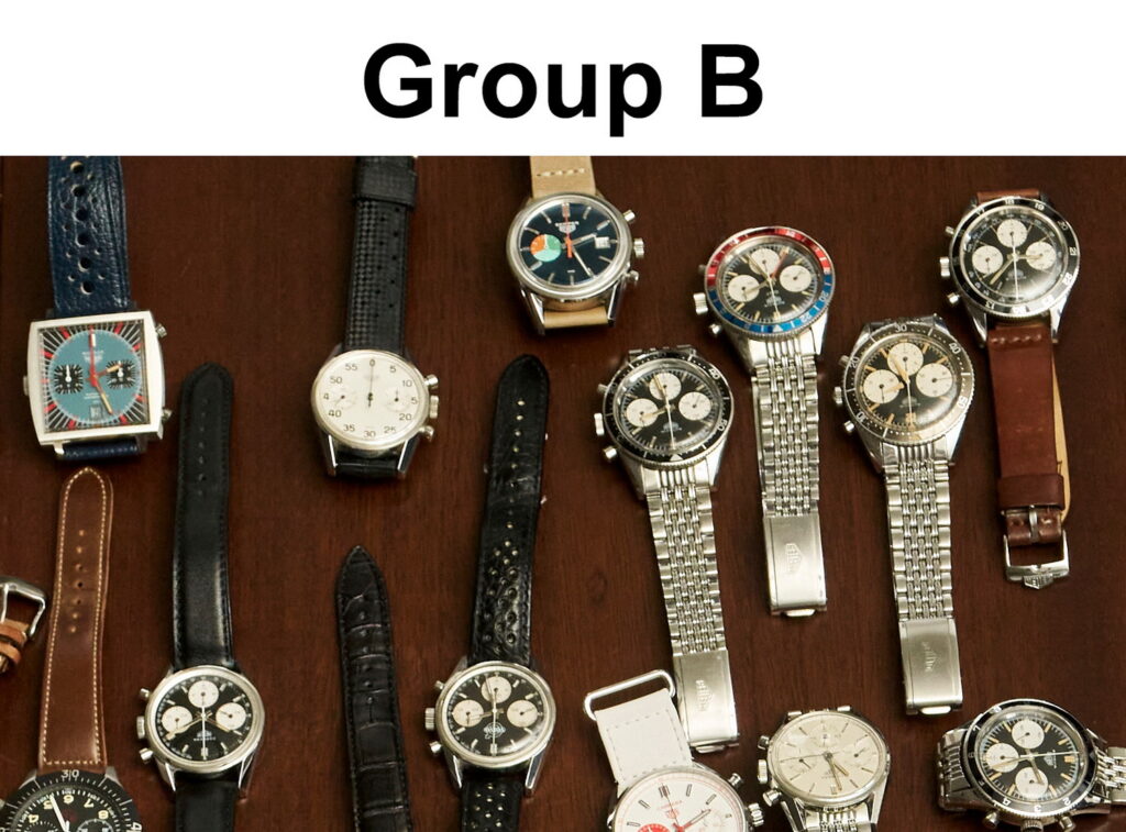 The type of watches included in each of the Groups is almost entirely random — collectors quickly dropped their watches onto the table, and there was no attempt to arrange them in any particular manner. For each of these nine Groups, the list of watches presented in this posting goes left to right across the image. It’s “longitude” that drives the ordering of the watches, without regard to “latitude.”
